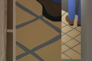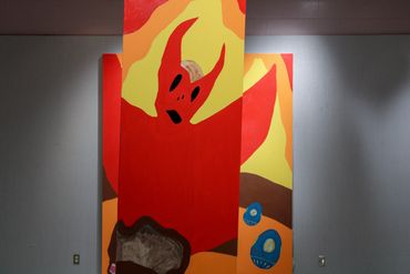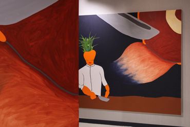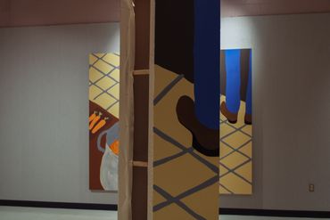 The installation explores the act and experience of viewing art while engaging in the physicality of a large-scale painting. Simon’s work includes vibrant color fields, jarring imagery such as bat-monsters and goblin-pasta, and matte applications of oil paint that defy the traditionally shiny medium. The paintings conspire around an obstructive pillar, playfully and enigmatically linking each work together.